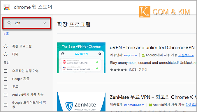 위 크롬 웹 스토어로 접속한 후 왼쪽 박스에 'vpn'을 입력하고 엔터 칩니다.