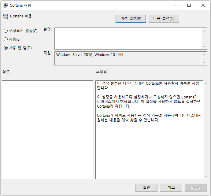 5. 아래와 같이 상태를 [사용 안 함]으로 변경하면 코타나 비활성화가 완료됩니다.