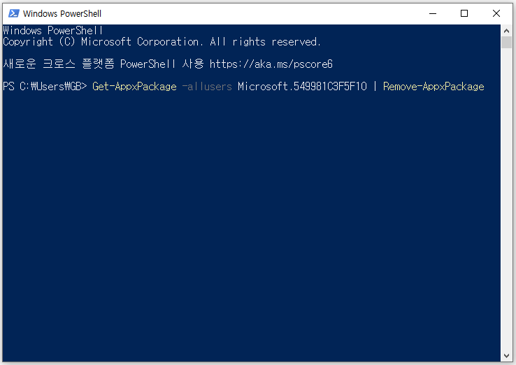 4. 열리는 powershell 창에 아까 받아둔 문서 파일에 있는 명령어를 붙여 넣고 엔터를 치면 코타나 삭제 작업이 진행됩니다.
