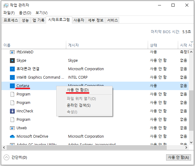 3. 목록에서 Cortana에 대고 마우스 오른쪽 버튼을 클릭합니다.