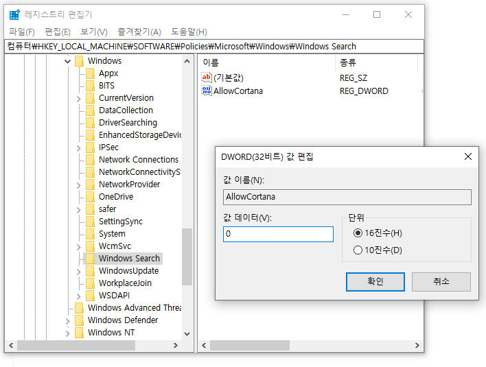 4. 우측에 있는 AllowCortana 값을 0으로 변경합니다.