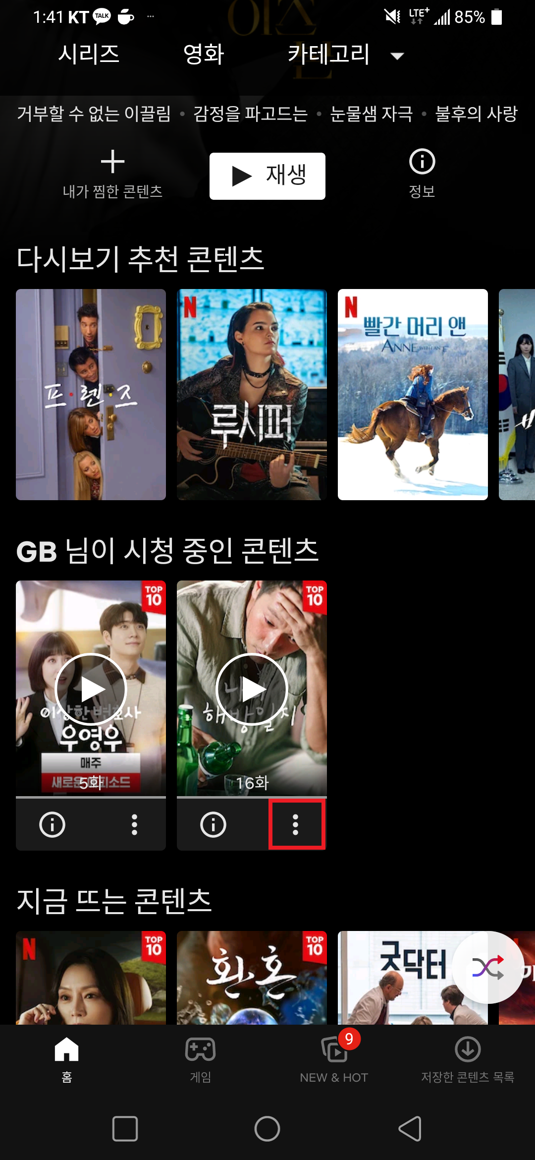 1. 먼저 시청 중인 콘텐츠 하단에 있는 땡땡이 모양(점 세 개)의 아이콘을 터치합니다.