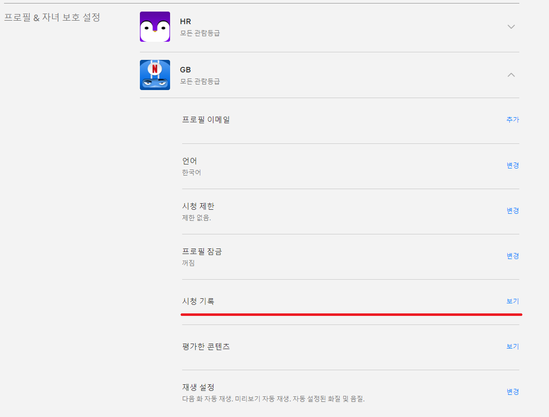 3. 시청기록을 삭제하려는 계정을 선택하면 아래와 같은 메뉴가 열립니다. 시청기록 우측에 있는 [보기]를 선택합니다.