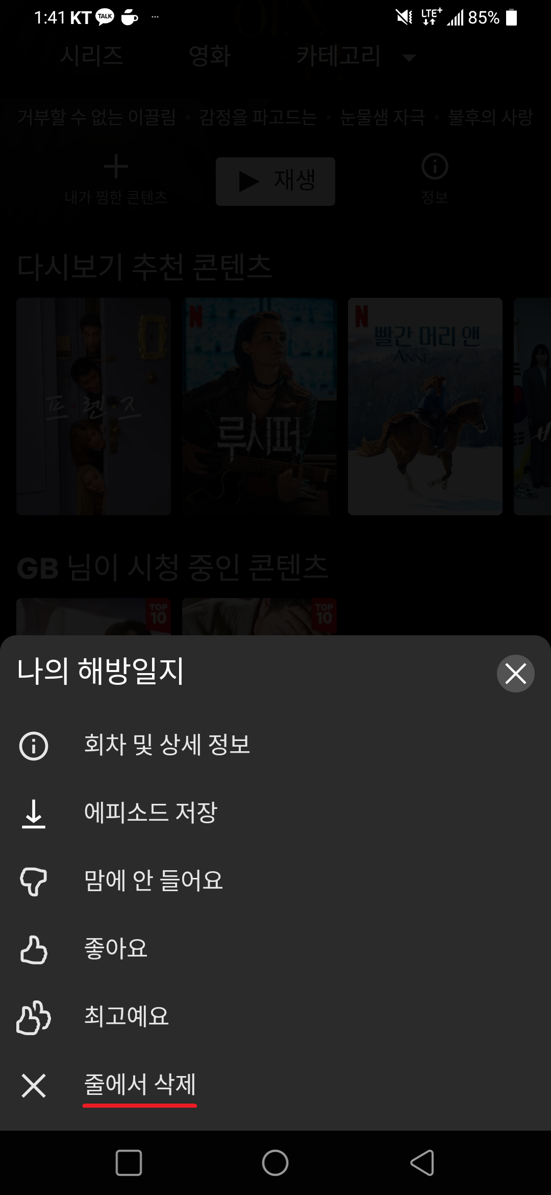 2. 열리는 메뉴에서 [줄에서 삭제]를 선택하면 시청 중인 콘텐츠 목록에서 해당 컨텐츠가 삭제됩니다.